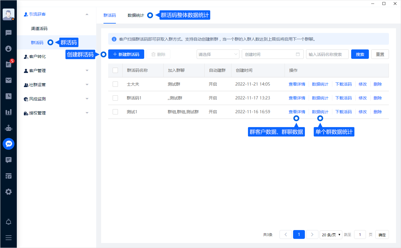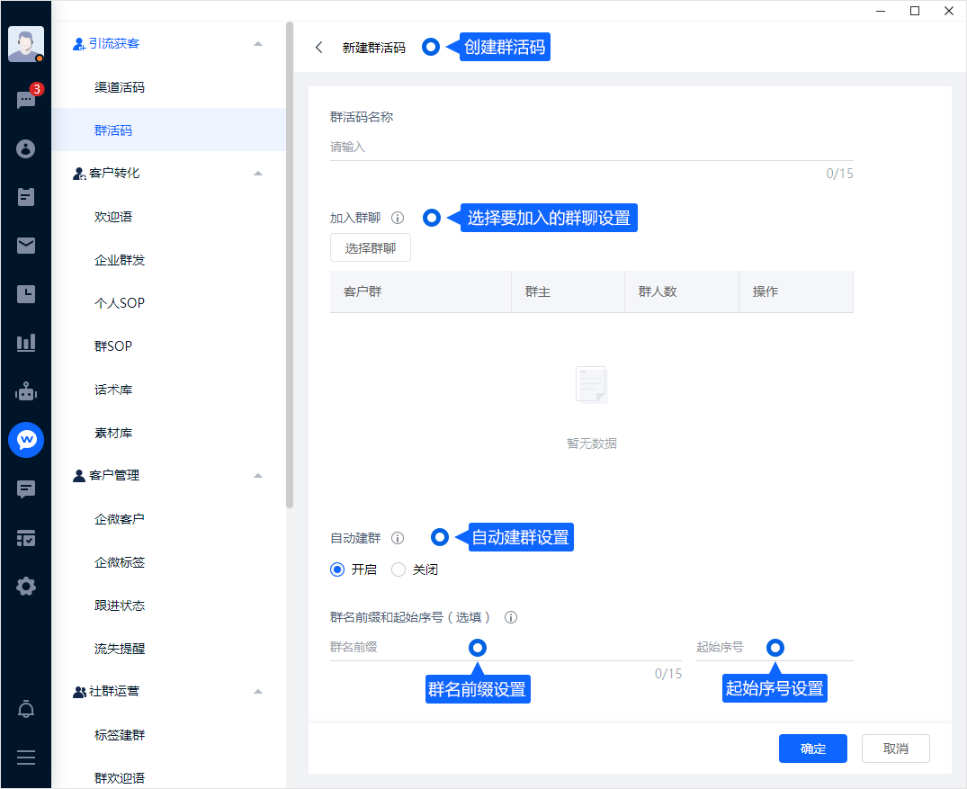 - 群活码:用于客户扫码加入企业微信群的二维码,当社群人数达上线后,可自动创建新群功能,自动建群。