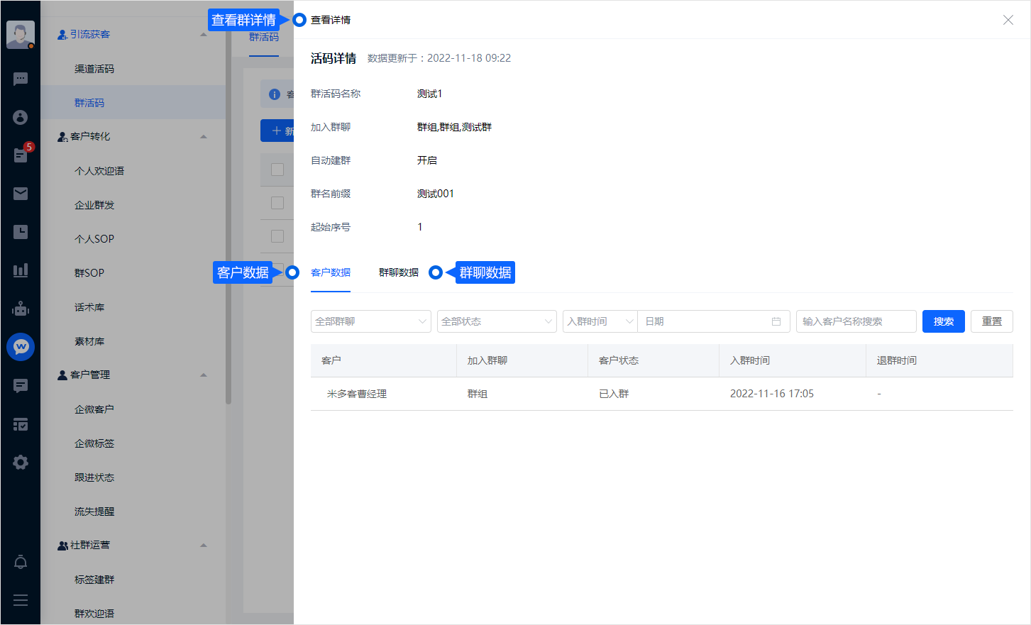 米多客企微助手支持群数据统计,还可以查看到客户入群或退群时间、客户状态,以及群状态和群信息等。