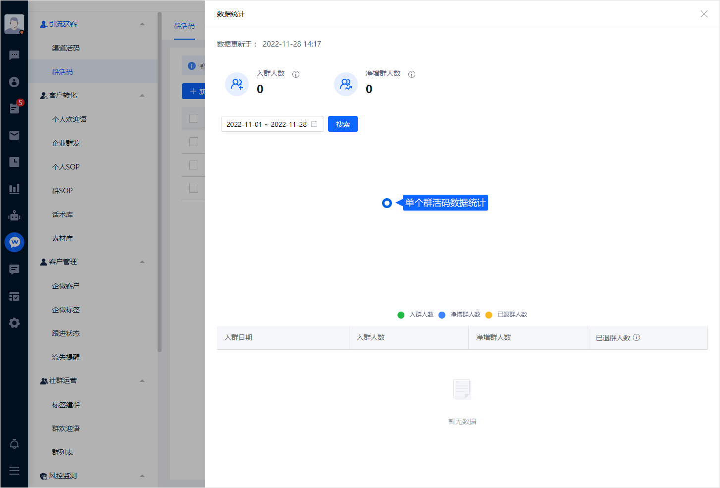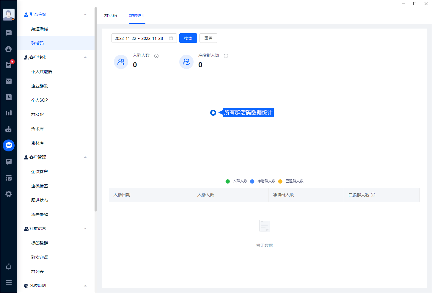 米多客支持多方位的数据统计,统计内容包括入群人数、净增群人数,以及入群人数曲线图、净增入群人数曲线图、已退群人数曲线图等。
