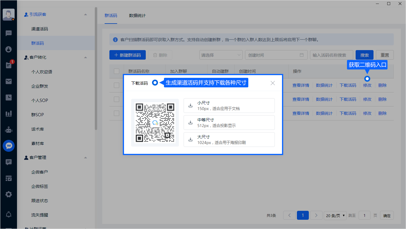 在「企微助手 - 引流获客」中即可分别设置渠道活码、群活码。