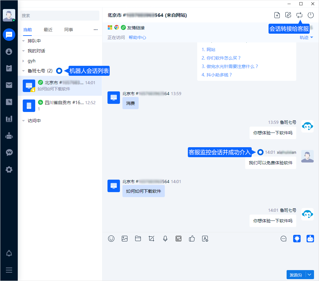 能够将机器人设置为友好对象的客服人员,可以在对话列表中实时监控机器人的会话进程。