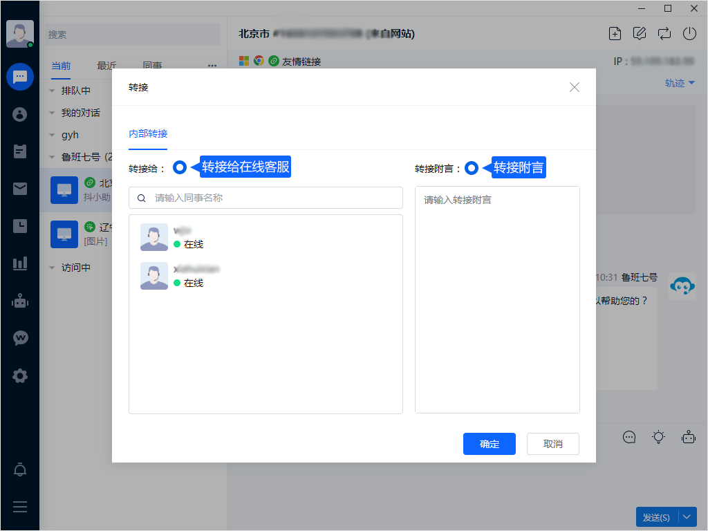 有权限的客服人员,可以通过对话窗口上方的【转接】按钮,将该会话转接给任意在线客服,并可以填写转接附言。同时有权限的客服人员也可以手动终止会话,和创建工单以及对会话进行评估。