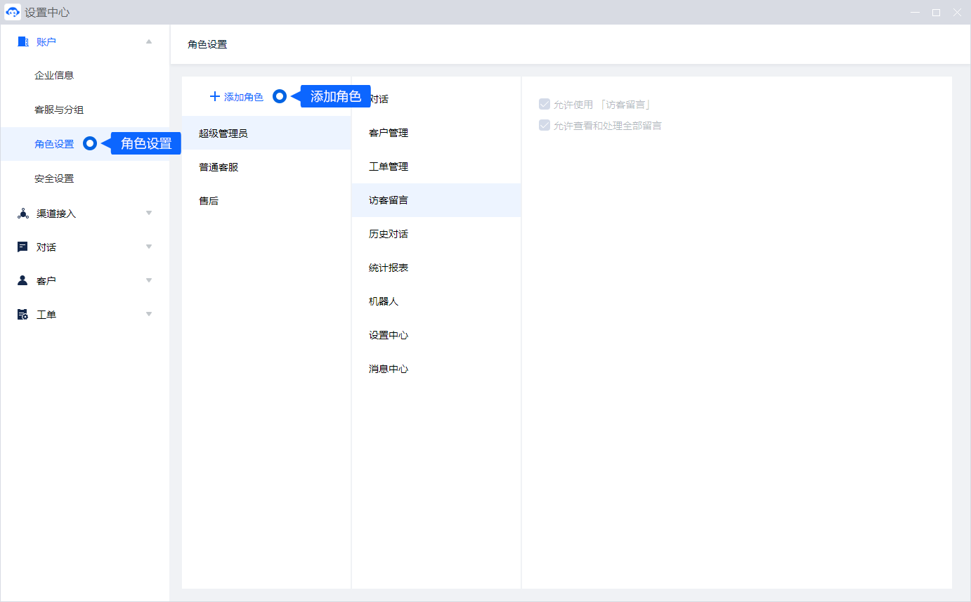 允许使用 「设置中心」、允许查看和修改 「账户」 设置、允许查看和修改 「渠道接入」 设置、允许查看和修改 「对话」 设置、允许查看和修改 「客户」 设置、允许查看和修改 「工单」 设置; - 消息中心