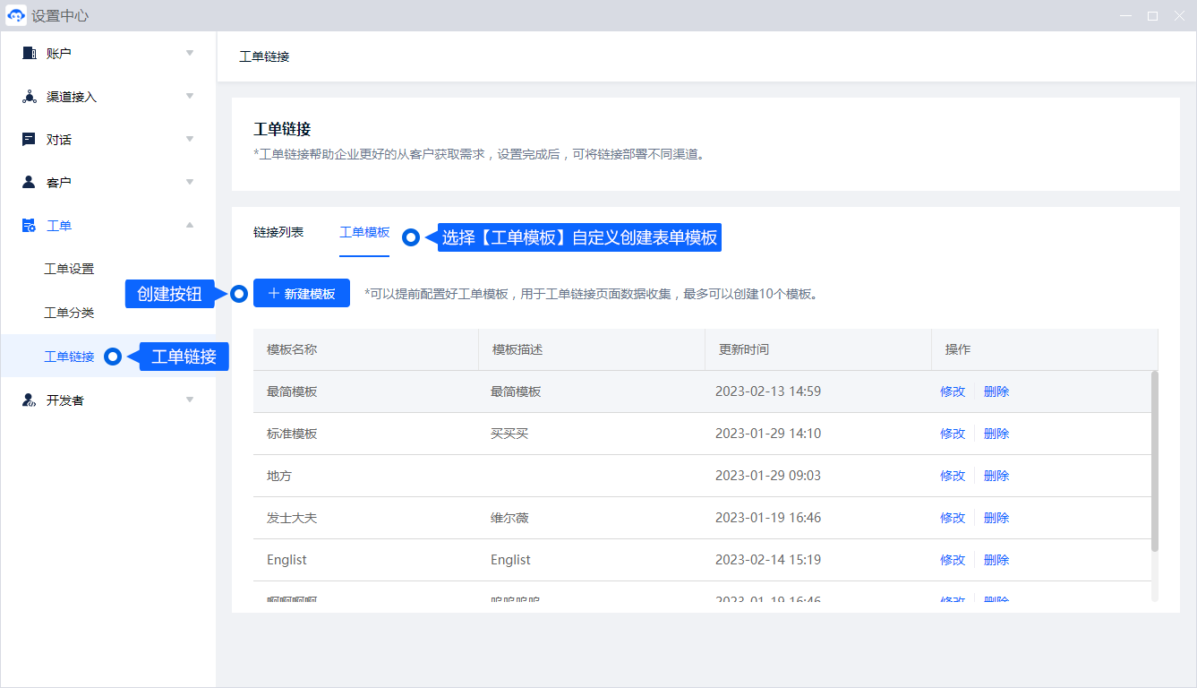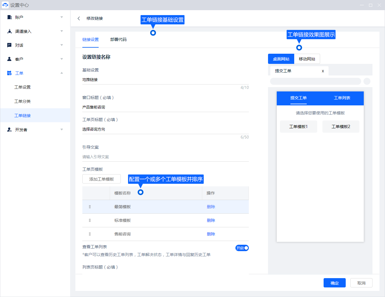 - 工单页模板:为链接绑定一个或多个工单模板;