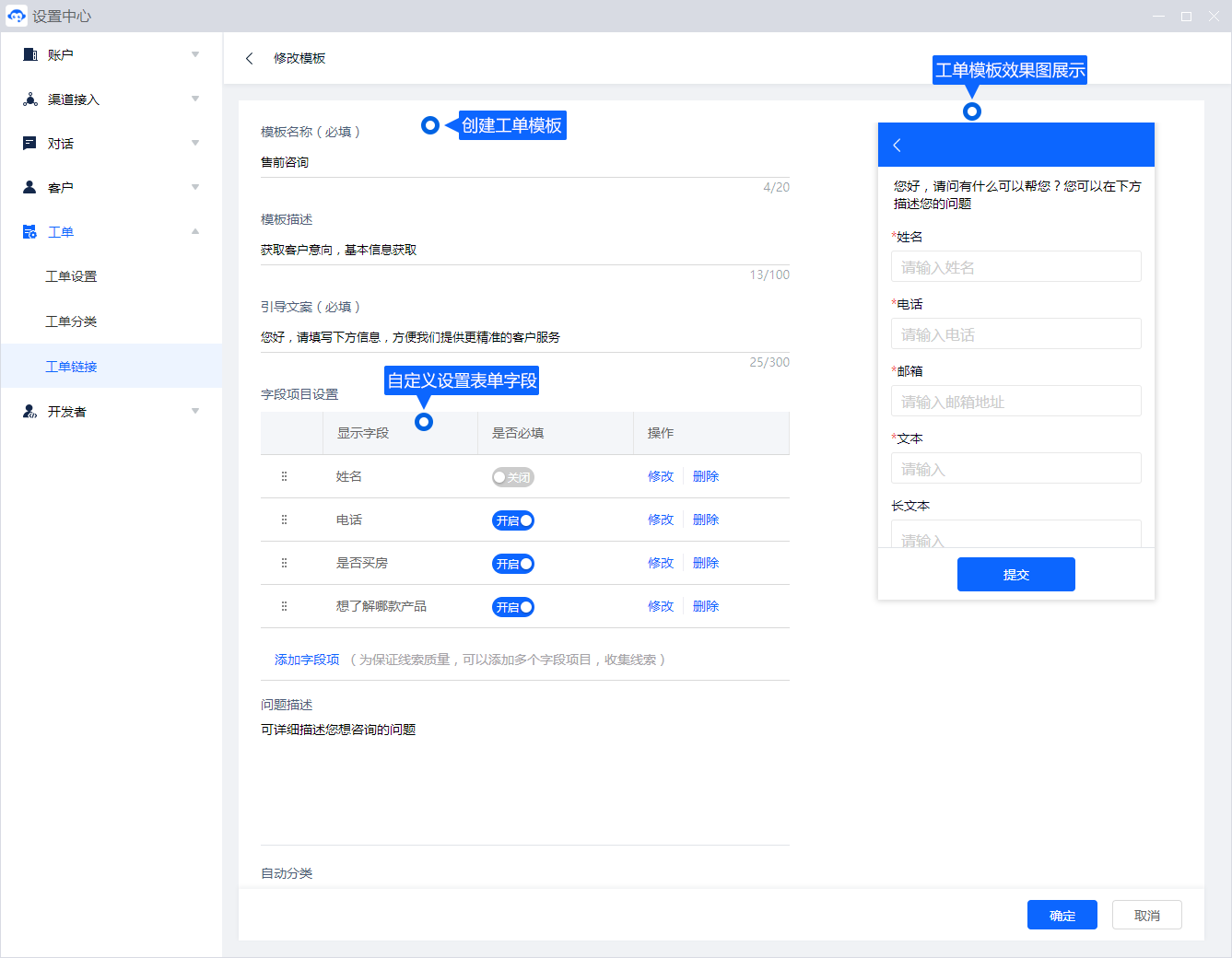 - 引导文案:设置工单模板上方的提示语文案,引导客户填写表单;