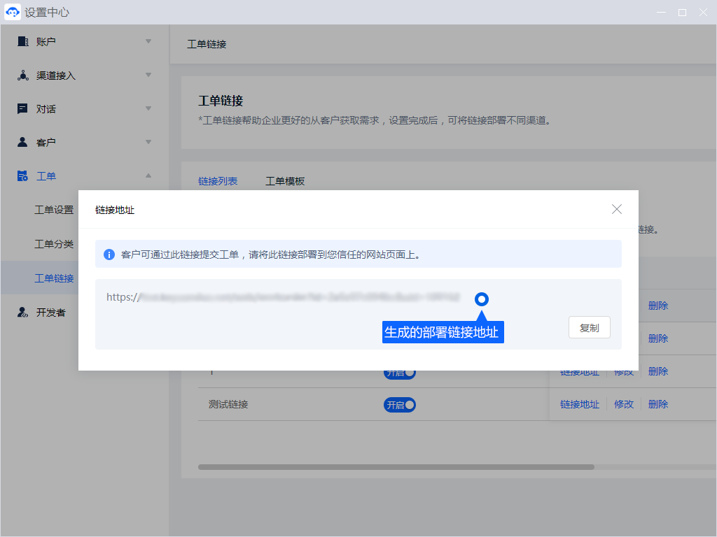 工单链接配置成功后,米多客自动生成部署链接。企业可将链接部署到各个渠道,从而实现推广。
