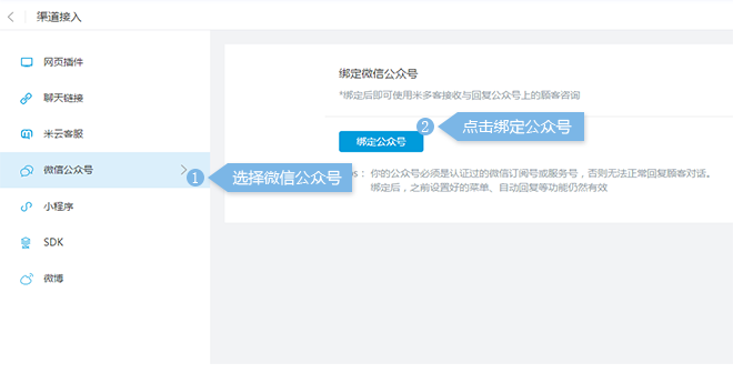 第一步:设置界面-渠道接入-微信公众号