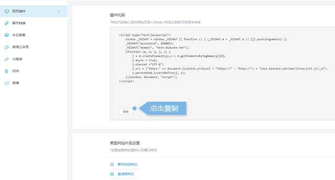 第三步:将此代码嵌入到网站页面 </body> 标签之前即可启用米多客