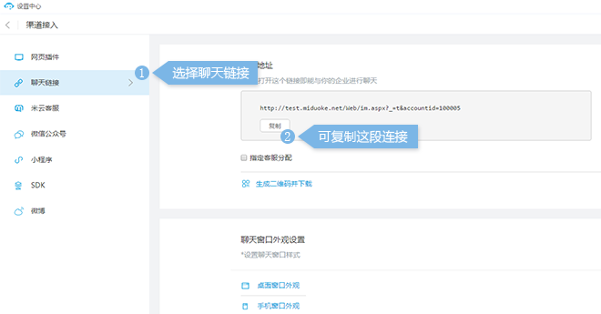设置-渠道接入-聊天链接